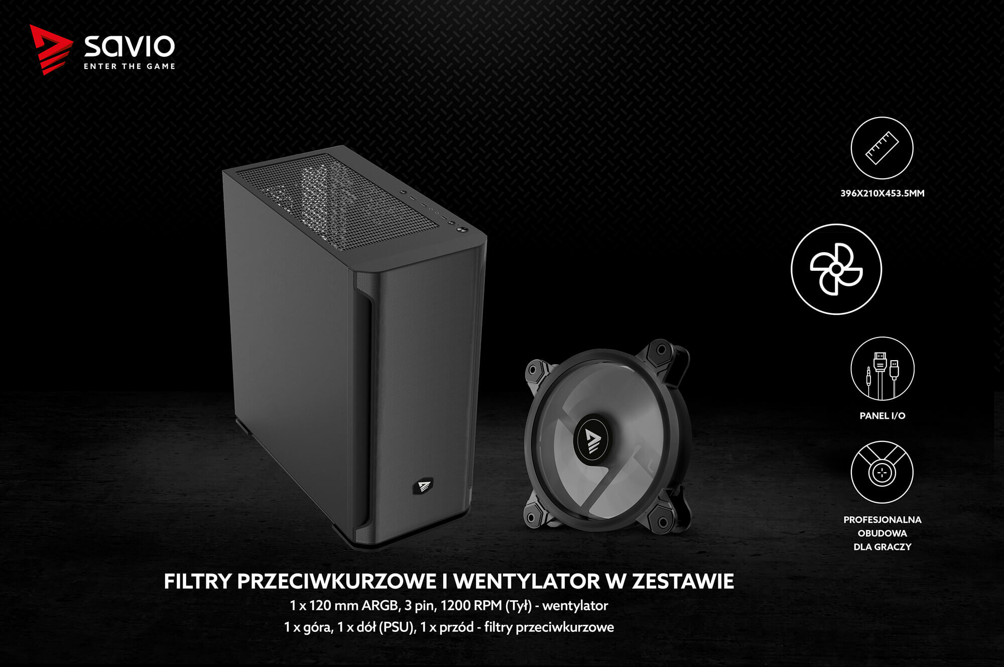 Obudowa jest wyposażona fabrycznie w jeden, mocny choć cichy, wentylator. Zapewnia on optymalny poziom temperatury procesora i innych podzespołów. Savio Shadow jest bohaterem drugiego planu, pozwoli Ci na pełne skupienie na rozgrywce, nie rozpraszając Twojej uwagi.