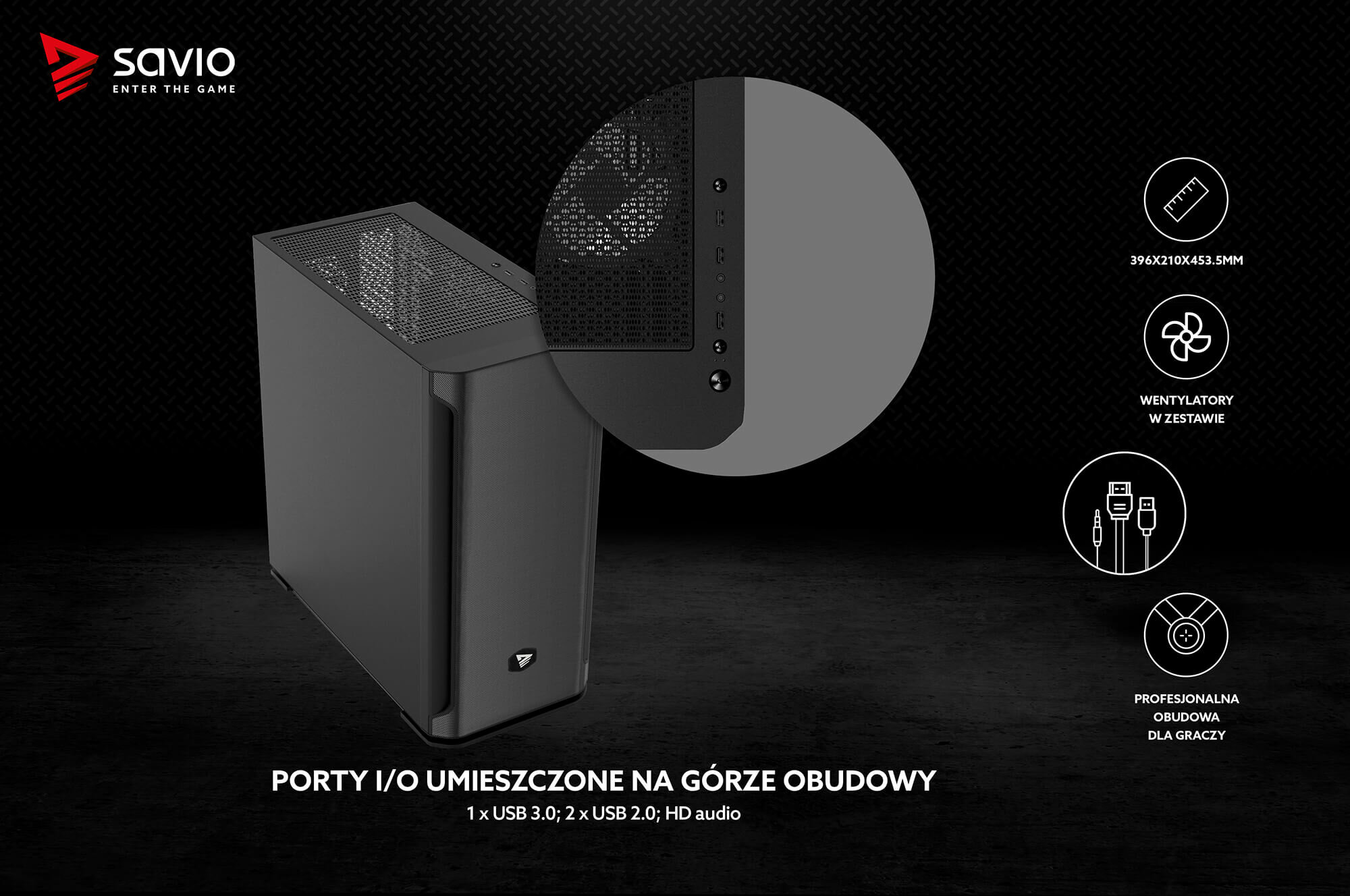 Panel I/O w SAVIO Shadow X1 wyposażony został w standardowe przyciski Power ON, Reset, a także 1 port USB 3.0 i 2 porty USB 2.0, wyjścia i wejścia HD Audio oraz dodatkowy przycisk RESET/LED do zarządzania efektami świetlnymi.