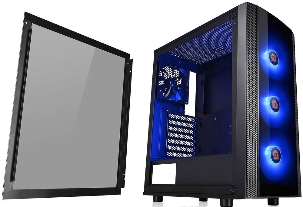 Obudowa PC THERMALTAKE VERSA J25 RGB TG w czarnym kolorze będzie doskonałym i eleganckim dopełnieniem dla wszystkich podzespołów domowego komputera. Można je efektownie wyeksponować, gdyż obudowa ta ma okno wykonane z hartowanego szkła. Obudowa typu Midi Tower pozwala komfortowo doposażyć komputer w domu we wszelkie niezbędne napędy, dyski, karty, itp. Została wyposażona w aż cztery niewielkie wentylatory, które gwarantują idealne środowisko pracy dla wszystkich komponentów komputera.