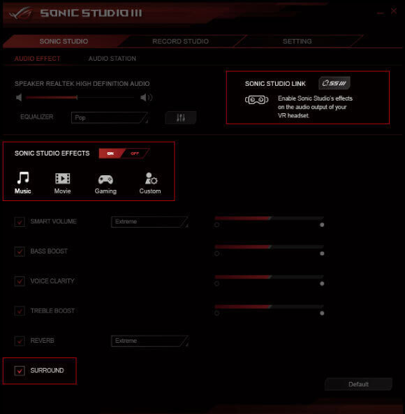 Sonic Studio obsługuje teraz także wirtualny dźwięk przestrzenny w zestawach VR, w oparciu o technologię HRTF (head - related transfer function*), tworząc niesamowicie wciągającą przestrzeń dźwiękową, dzięki której jeszcze głębiej zanurzysz się w akcję rozgrywki. Interfejs graficzny aplikacji Sonic Studio oferuje także całą gamę opcji korekcji dźwięku, za pomocą których możesz dopasować akustykę do swoich indywidualnych preferencji lub charakteru Twojego zestawu słuchawkowego.