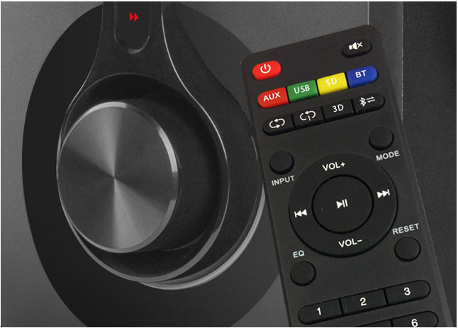| WYGODA UŻYTKOWANIAMożliwość komfortowego sterowania urządzeniem do gamingowa podstawa. Oprócz klasycznego On/OFF gracz dostaje możliwość kontroli poziomu basu oraz sopranów, przełączania pomiędzy trybami Bluetooth oraz AUX. To wszystko dzięki wygodnemu pilotowi, który jest dołączony do całego zestawu. Czytelny wyświetlacz pokazuje informacje o poziomie głośności, basu czy sopranu. Można też sterować tym za pomocą wbudowanego w przedni panel regulatora. |