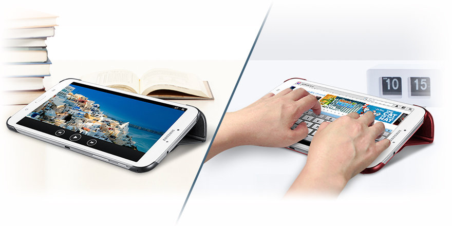 Korzystając z etui składanego do Galaxy Note 3 (8"), możesz ustawić swój tablet w wygodny dla siebie sposób. Możesz otworzyć pokrywę i wykorzystać ją jako stojak, co umożliwi ci wprowadzanie tekstu, oglądanie treści multimedialnych, edytowanie dokumentów oraz przeglądanie i udostępnianie zdjęć itp.
