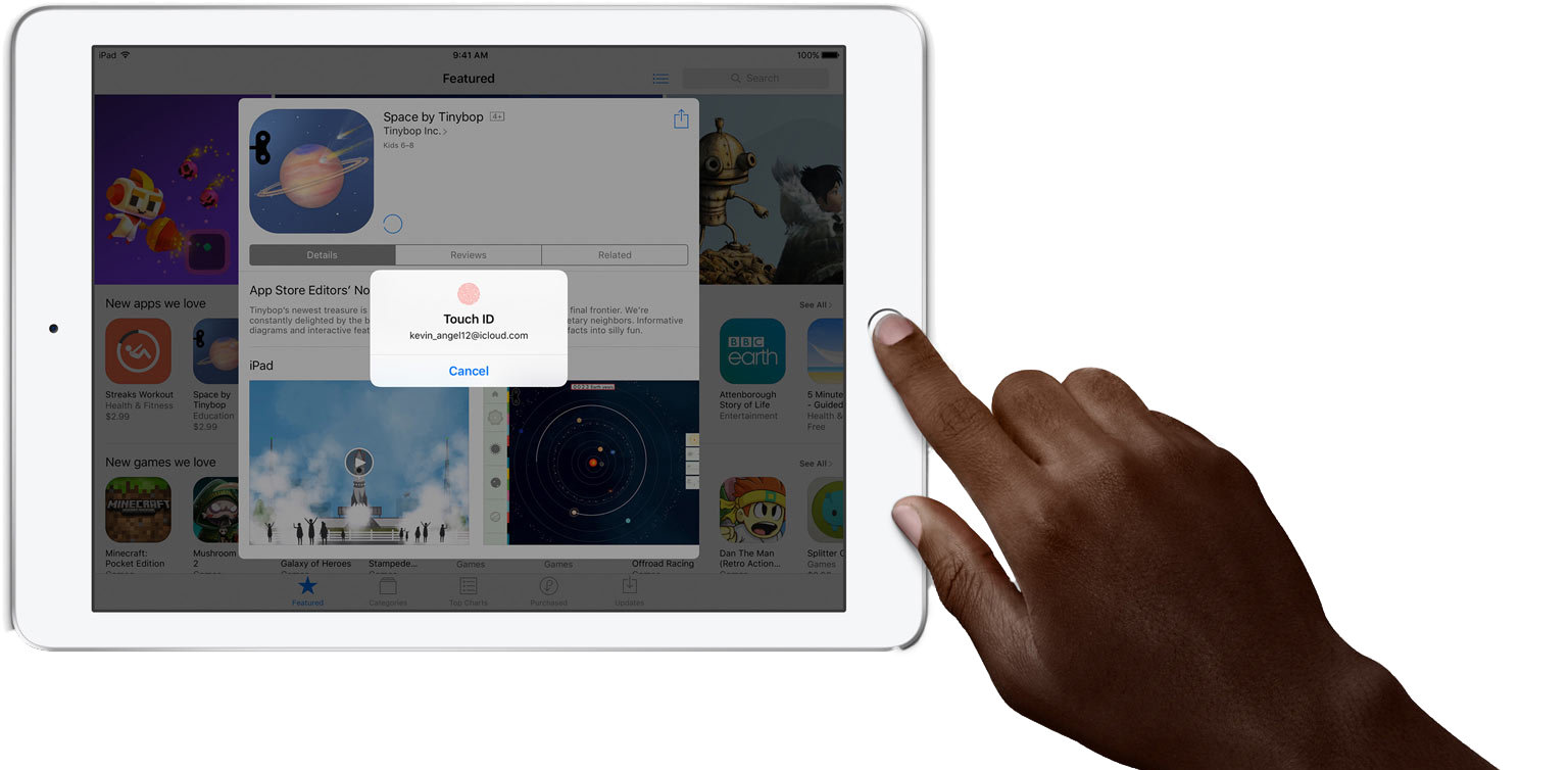 Odcisk palca to idealne hasło – nie do zgubienia i nie do podrobienia. Z Touch ID błyskawicznie odblokujesz iPada i zadbasz o bezpieczeństwo swoich poufnych danych w aplikacjach.