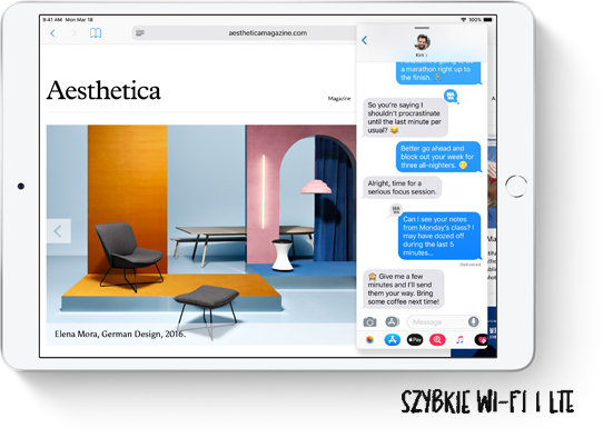 Dzięki Wi-Fi do 866 Mb/s oraz 4G LTE Advanced z iPadem Air zawsze jesteś w kontakcie2. Bezprzewodowym. A technologia eSIM oznacza, że możesz bez trudu korzystać z planów taryfowych na transmisję danych w dowolnym miejscu na świecie.