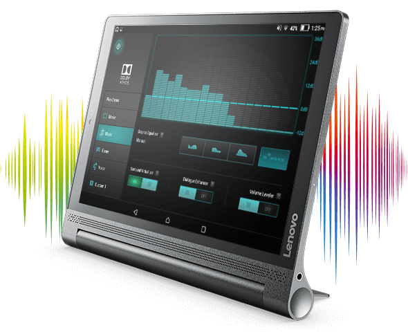 Yoga Tab 3 Plus zapewnia bogaty, przestrzenny dźwięk w jakości niespotykanej w innych tabletach. Cztery duże, zintegrowane głośniki JBL skierowane do przodu oraz zaawansowana technologia Dolby Atmos® dają głośny, czysty, dynamiczny dźwięk, dzięki któremu znajdziesz się w samym centrum wydarzeń – nawet bez słuchawek!