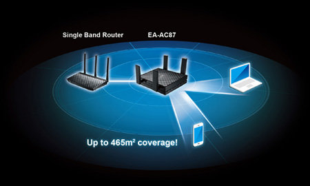 Niezrównany zasięg sygnałuZa sprawą konfiguracji anten 4x4 (4 nadawczych i 4 odbiorczych) tryb punktu dostępu EA-AC87 zapewnia zasięg bezprzewodowy do 465 m2 (około 5000 stóp kw.) — jest więc idealnym wyborem do dużych domów czy budynków wielopiętrowych3. Co więcej, ASUS AiRadar inteligentnie wzmacnia łączność bezprzewodową, używając uniwersalnej technologii formowania wiązki 802.11ac, wzmacniania o dużej mocy i wyjątkowego dostrajania ASUS RF. EA-AC87 pozwala na płynne strumieniowanie dwóch filmów 4K na maksymalnym zasięgu, co potwierdzają rzeczywiste testy. |