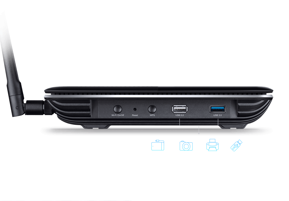 Podłącz do routera dysk zewnętrzny i ciesz się łatwym dostępem do plików z każdego miejsca w sieci, dzięki portom USB 3.0 i 2.0. Gigabitowe porty Ethernet routera Archer C3150 pozwalają na 10 razy szybsze prędkości niż standardowe porty Ethernet, dzięki czemu możesz w pełni wykorzystać możliwości swoich urządzeń