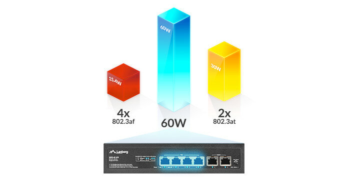 | ROZWIĄZANIE BEZ KOMPROMISÓW - REALNY BUDŻET POE: 60 WSwitch został wyposażony łącznie w 6 portów, w tym 4 porty PoE+ (Fast Ethernet) oraz 2 Uplink (Fast Ethernet). Przemyślana konstrukcja i dbałość o jakość komponentów zapewnia użytkownikowi aż do 60 W całkowitej realnej mocy dla urządzeń końcowych, co oznacza możliwość podłączenia równocześnie: