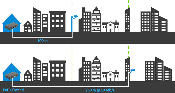 | TRYB EXTEND DO 250 METRÓWStandardowe switche zgodnie ze standardem zapewniają możliwość pracy urządzeń w odległości do 100 m na jednym odcinku kabla. Jednakże czasem okazuje się, że ze względu na rozległą sieć szkieletową oraz złożone środowisko, podczas opracowywania okablowania i sieci wymagane jest niestandardowe rozwiązanie, które wykracza poza standard. W przypadku rozwiązań monitoringowych jest to dość często występujący problem, najczęściej wynikający ze zbyt dużej odległości między urządzeniem dystrybucyjnym a urządzeniem końcowym. Przełączniki Lanberg posiadają funkcję umożliwiającą transmisję danych (max. 10 Mb/s) oraz zasilania PoE+ do 250 m na jednym odcinku kabla. Wystarczy przełączyć przycisk na pozycję „PoE+ Extend 250 m” na obudowie, aby zapewnić działanie na dłuższym odcinku dla portów 1 ~ 4. Rozwiązanie zostało wprowadzone z myślą o systemach monitoringu oraz IP jak i kontroli dostępu, szczególnie jeśli urządzenia końcowe znajdują się na zewnątrz bez możliwości instalacji dodatkowych punktów dystrybucyjnych sieci. |