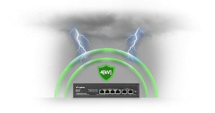 4 kV OCHRONY PRZECIWPRZEPIĘCIOWEJSam przełącznik, jak i urządzenia do niego podłączone, są wielokrotnie narażane na różne zagrożenia, w tym na wyładowania prądu, które mogą przepływać zarówno przez kable zasilające, jak i sieciowe. Mając na uwadze bezpieczeństwo urządzeń, jak i ich użytkowników, Lanberg wyposażył przełącznik w zintegrowany układ ochronny przeciw wyładowaniom, gwarantujący zabezpieczenie 4 kV wszystkim portom, skutecznie zmniejszając ich uszkodzenia z powodu gwałtownego wzrostu napięcia. W standardowych warunkach praca w sieci będzie odbywać się dalej bez zakłóceń, switch będzie kontynuował pracę bez jakichkolwiek przerw, a użytkownik zyskuje bezpieczeństwo pracy urządzenia, jak i infrastruktury. | |