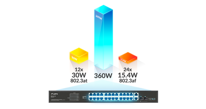 | ROZWIĄZANIE BEZ KOMPROMISÓW - REALNY BUDŻET POE: 360 WSwitch został wyposażony łącznie w 28 portów, w tym 24 porty PoE+ (Fast Ethernet) oraz 2 Uplink (Combo Gigabit). Przemyślana konstrukcja i dbałość o jakość komponentów zapewnia użytkownikowi aż do 360 W całkowitej realnej mocy dla urządzeń końcowych, co oznacza możliwość podłączenia równocześnie: