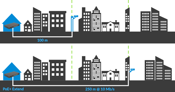| TRYB EXTEND DO 250 METRÓW Z VLANStandardowe switche zgodnie ze standardem zapewniają możliwość pracy urządzeń w odległości do 100 m na jednym odcinku kabla. Jednakże czasem okazuje się, że ze względu na rozległą sieć szkieletową oraz złożone środowisko, podczas opracowywania okablowania i sieci wymagane jest niestandardowe rozwiązanie, które wykracza poza standard. W przypadku rozwiązań monitoringowych jest to dość często występujący problem, najczęściej wynikający ze zbyt dużej odległości między urządzeniem dystrybucyjnym a urządzeniem końcowym. Przełączniki Lanberg posiadają funkcję umożliwiającą transmisję danych (max. 10 Mb/s) oraz zasilania PoE+ do 250 m na jednym odcinku kabla z funkcją odseparowania portów PoE między sobą (VLAN). Wystarczy przełączyć przycisk na pozycję „PoE+ Extend 250 m” na obudowie, aby zapewnić działanie na dłuższym odcinku i separację dla portów 1 ~ 24. Rozwiązanie zostało wprowadzone z myślą o systemach monitoringu oraz IP jak i kontroli dostępu, szczególnie jeśli urządzenia końcowe znajdują się na zewnątrz bez możliwości instalacji dodatkowych punktów dystrybucyjnych sieci. |