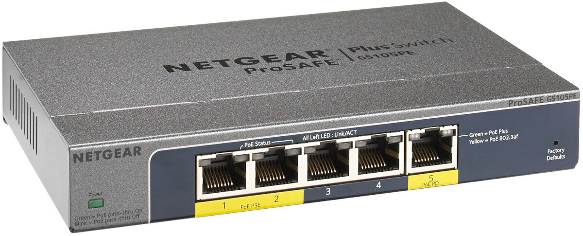 Switch NETGEAR GS105PE-10000S to wyjątkowa wartość dla firm, które chcą zwiększyć inteligencję swojej sieci, wykraczając poza możliwości niezarządzalnych przełączników. Prosta obsługa sprawia, że prezentowany model wykorzystywany jest także w warunkach domowych. W błyskawicznym tempie można przystosować go do indywidualnych preferencji. Użytkownik może korzystać z 5 portów RJ45 (w tym 2 porty z obsługą PoE).