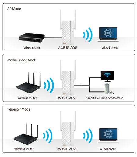 media bridge Dwa dodatkowe tryby RP-AC66 czynią to urządzenie jeszcze bardziej wszechstronnym. Poza trybem wzmacniacza, można wykorzystać go również jako bezprzewodowy punkt dostępu (AP) lub jako media bridge. W trybie AP może być podłączony do dowolnej przewodowej sieci LAN — np. sieci dostępnej w hotelu — byś mógł utworzyć własny hotspot Wi-Fi, dzięki czemu uzyskasz dostęp do Internetu z laptopów, telefonów czy innych urządzeń obsługujących Wi-Fi. W trybie media bridge, może być podłączony do dowolnego urządzenia kompatybilnego z Ethernet, takiego jak urządzenie smart TV, odtwarzacz multimedialny, konsola do gier czy PC — by dać im możliwości Wi-Fi. To świetny sposób na pozbycie się plątaniny kabli! |