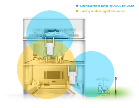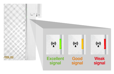 RP-AC56 dzięki wskaźnikowi mocy sygnału Aby uzyskać najlepsze rezultaty, RP-AC66 musi znajdować się w zasięgu stabilnego sygnału routera i powinien być umieszczony pomiędzy routerem a miejscem, które potrzebuje silniejszego zasięgu sieci bezprzewodowej. RP-AC66 pracuje najlepiej, gdy odbiera silny sygnał bezprzewodowy z routera — możesz to sprawdzić na wskaźniku mocy sygnału, który znajduje się na przednim panelu. |
