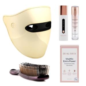 Zestaw BEAUTIFLY Maska LED do Fototerapii Aura GOLD + Urządzenie do peelingu kawitacyjnego B-Scrub PRO Slim 29 kHz + Szczotka do włosów Essa Hair Brush + Krem A.M. Dose of Beauty 50 ml + Suplement diety Vitamin Extra Power (30 szt.)