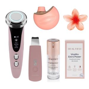 Zestaw BEAUTIFLY Masażer SucSetter Delight + Urządzenie do mezoterapii bezigłowej B-Glossy Blush + Urządzenie do peelingu kawitacyjnego B-Scrub Blush 26 kHz + Klamra do włosów A08 Kwiatek + Krem pod oczy So Soft Eye Cream 15 ml + Suplement diety Vitamin Extra Power (30 szt.)