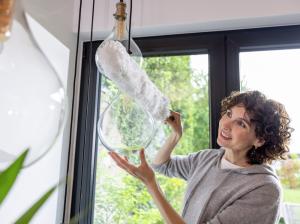 Dzięki nadającej się do prania zmiotce nie ma potrzeby kupowania nowych ściereczek, które generują niepotrzebne odpady. Aby wyczyścić zmiotkę SUPERDUSTER XL, wystarczy ją wytrzepać, w razie potrzeby wyprać w pralce, a następnie wstrząsnąć i pozostawić do wyschnięcia. Tekstylna część odzyskuje wtedy swój elastyczny i puszysty kształt.