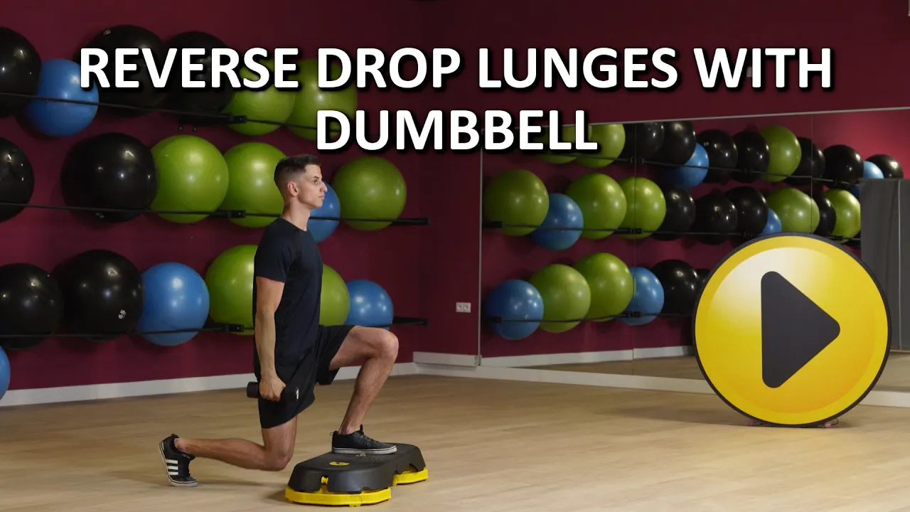 Reverse drop lunges with dumbbell, czyli zakroki z hantlami wykonywane z podwyższenia to ćwiczenie, które pozwoli dodatkowo podkręcić efektywność treningu nóg. Ponadto zakroki stabilizują i wzmacniają core, pośladki oraz ścięgna podkolanowe.