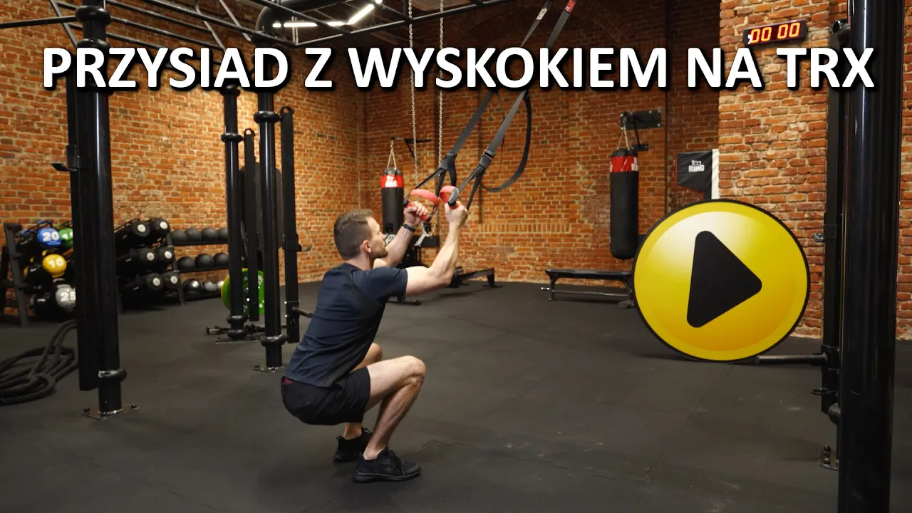 - Z wdechem zejdź do przysiadu tak, by uzyskać w kolanach kąt prosty, pamiętając o zachowaniu napięcia TRX-a;