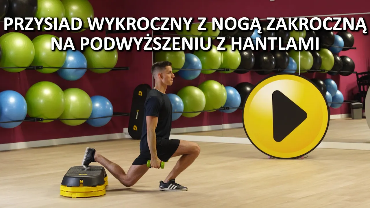 Przysiad wykroczny z nogą zakroczną na podwyższeniu z hantlami to ćwiczenie, które wykonuje się w celu stymulacji mięśni kończyn dolnych, a także stawów kolanowego i biodrowego.