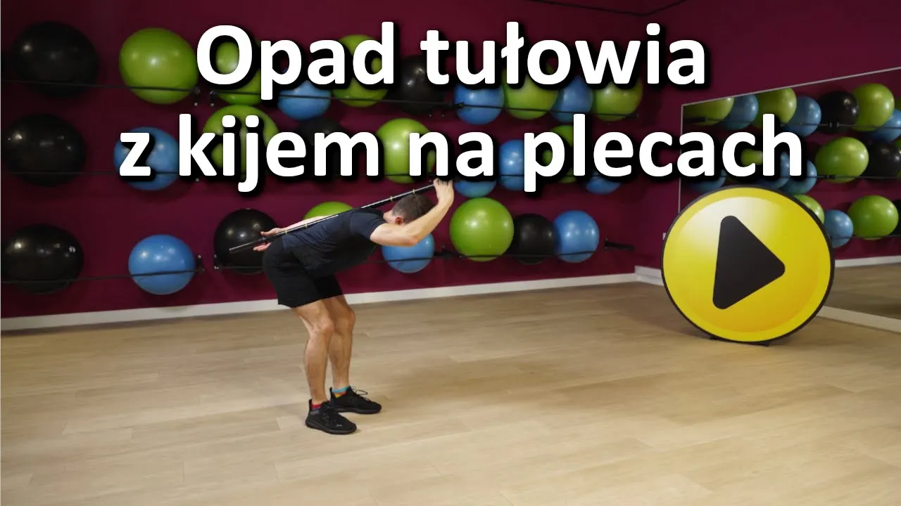 Opad tułowia z kijem na plecach to skuteczne ćwiczenie m.in. w przypadku dolegliwości bólowych kręgosłupa czy problemów z ruchem zawiasowym w biodrze.