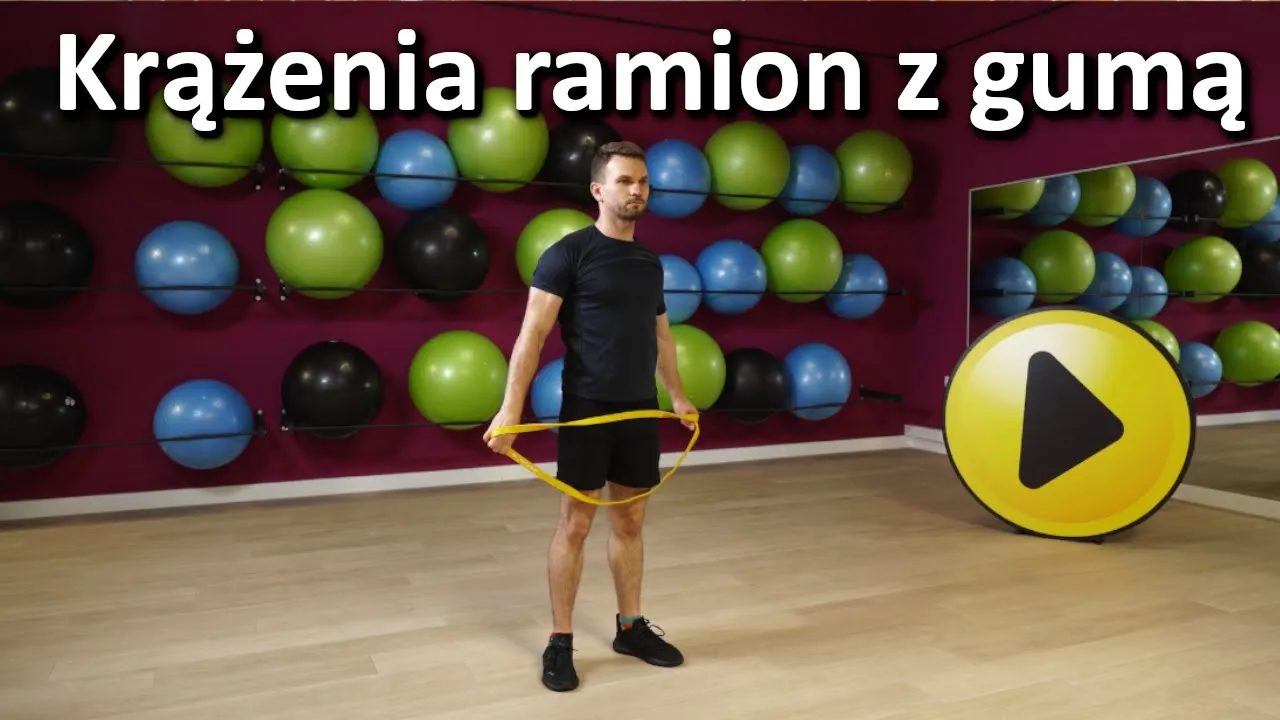 Krążenia ramion z gumą pozwolą zwiększyć ruchomość ramion oraz odpowiednio rozgrzeją górne partie ciała przed treningiem.