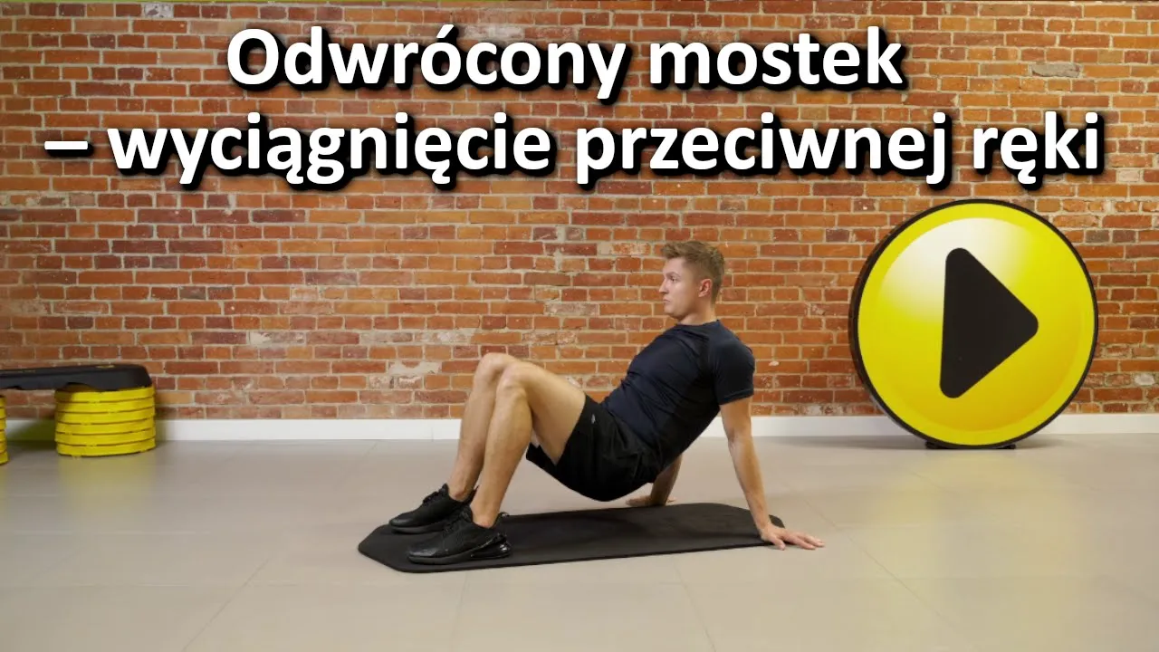 Ćwiczenie odwrócony mostek – wyciągnięcie przeciwnej ręki pozwoli na mobilizację odcinka piersiowego, co sprawdzi się m.in. przed treningiem martwego ciągu.