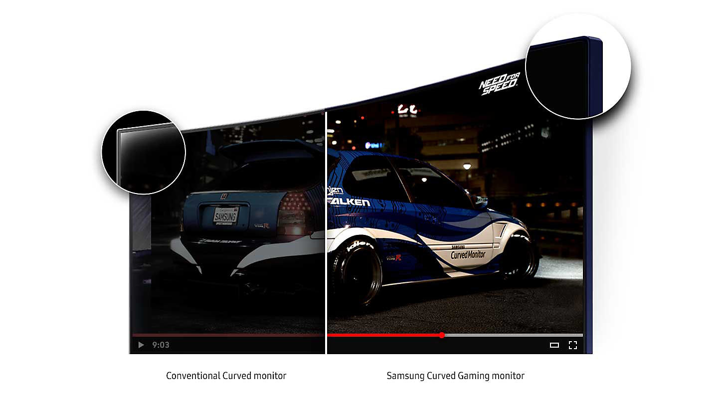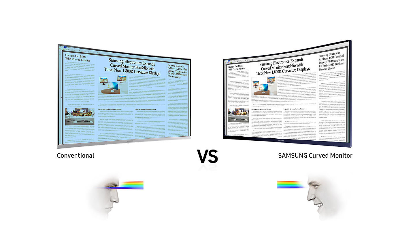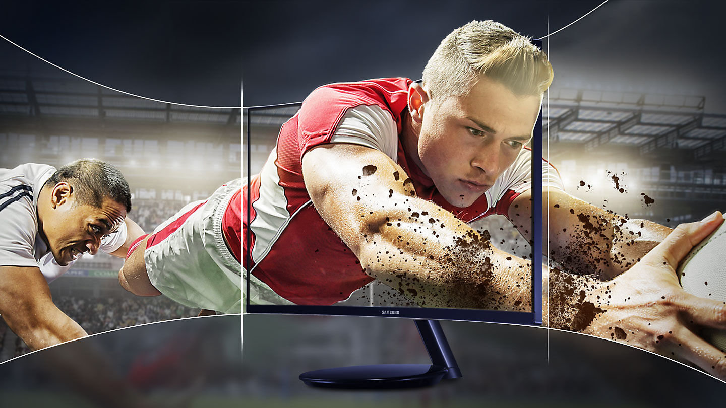 | Niezwykła głębia Krzywizna 1800 Monitor 1800 R Curved Samsung o największej krzywiźnie wśród monitorów dostępnych na rynku został zaprojektowany tak, aby zapewnić szerokie pole widzenia i głębię podczas oglądania filmów, co gwarantuje prawdziwy panoramiczny obraz. |