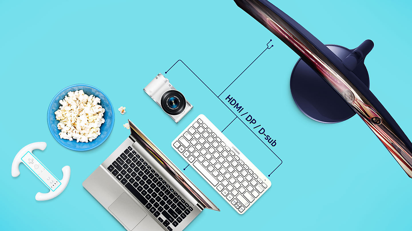 | Liczne porty dostępu Porty HDMI, DP i D-sub umożliwiają tworzenie wielu połączeń o wysokiej wydajności, które ułatwiają podłączanie komputerów, konsol do gier, dodatkowych monitorów oraz innych urządzeń, które zaspokajają potrzebę wielozadaniowości. |