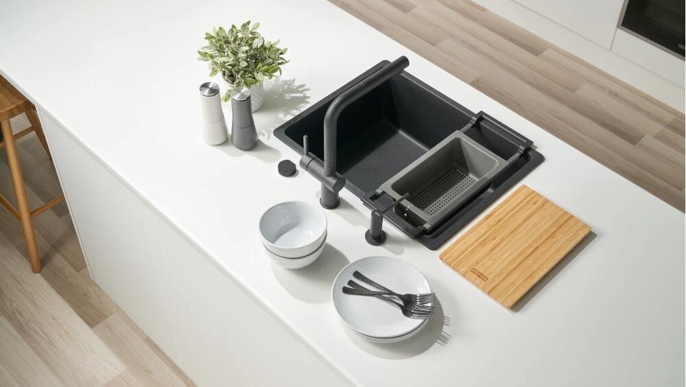 Możesz wyposażyć swój zlewozmywak we wszechstronną szynę teleskopową, na której możesz umieścić ociekacz lub deskę i która idealnie pasuje do zlewozmywaka o rozmiarze do 54 cm. Możesz dołożyć bambusową deskę do krojenia, która posłuży Ci do krojenia lub powiększenia przestrzeni roboczej blatu lub zlewozmywaka.