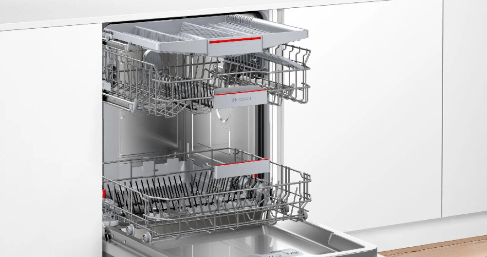 Szuflada BOSCH Vario3 ma nie tylko oddzielną przegródkę na każdy nóż, widelec i łyżkę, ale dzięki dwóm składanym czerwonym elementom pomieści także większe łyżki do zupy, szpatułki, małe filiżanki i pojemniki. Dzięki temu pozostaje więcej miejsca na pozostałe półki.