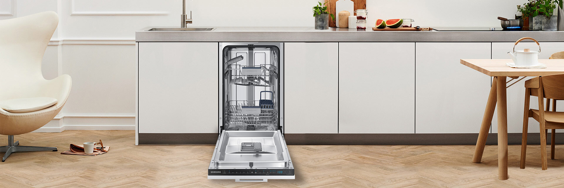 Zmywarka do zabudowy to funkcjonalny sprzęt, który idealnie uzupełni Twoją kuchnię. Możesz całkowicie dopasować wygląd urządzenia do wystroju wnętrza. Estetycznym rozwiązaniem jest umieszczenie panelu sterowania wewnątrz urządzenia. Czytelny, dotykowy panel sterowania zapewnia prostą obsługę zmywarki.