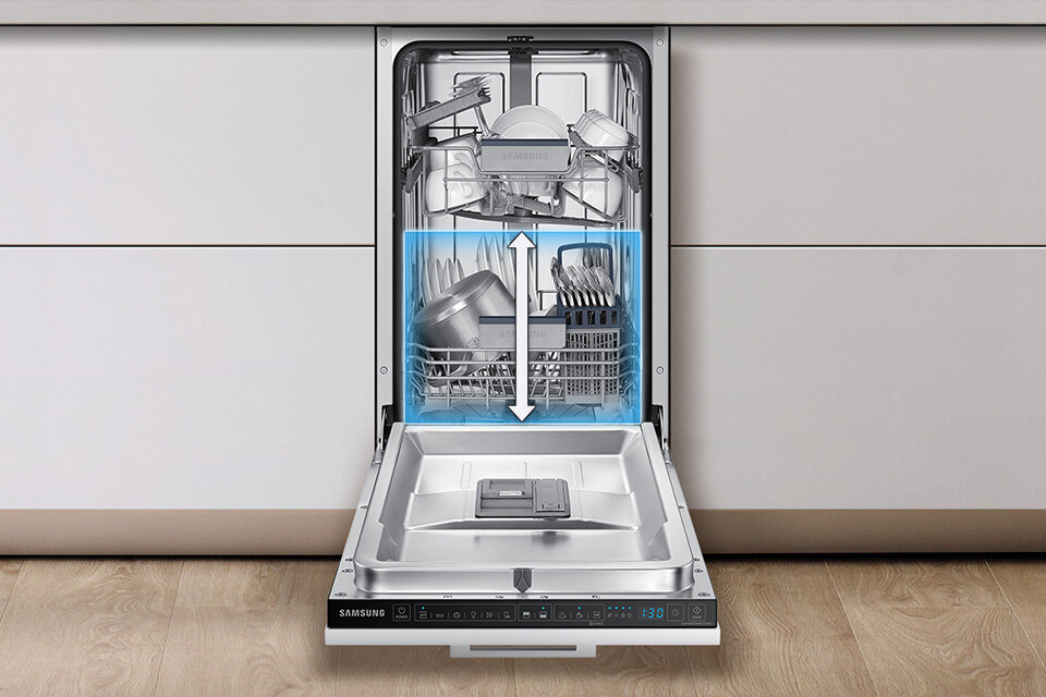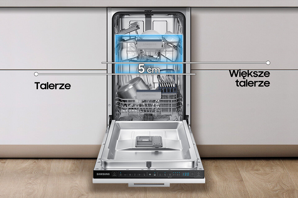 Za pomocą regulacji wysokości górnego kosza zmywarki, mycie dużych naczyń jest o wiele łatwiejsze. Kosz możesz podnieść lub opuścić w granicy aż do 5 cm. Teraz bez problemu wstawisz do zmywarki niestandardowej wielkości półmiski, talerze, garnki czy deski do krojenia.