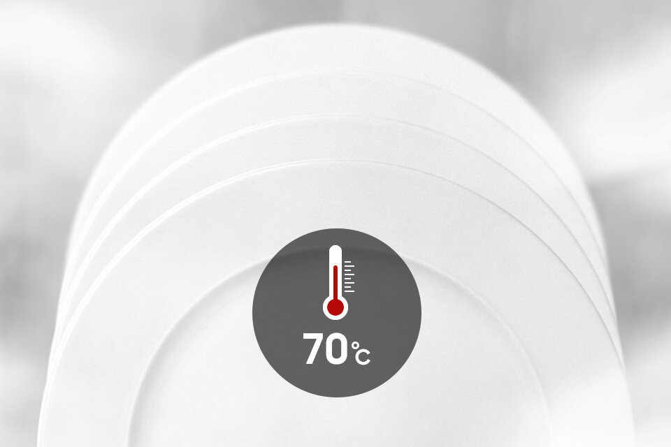 Kilkuminutowe utrzymanie bardzo wysokiej temperatury zwalcza szkodliwedrobnoustroje, pozostawiając naczynia sterylnie czyste. Woda podgrzana do 70°C rozbija cząsteczki detergentu i umożliwia ich pełne usunięcie z umytych naczyń. Funkcja dezynfekcji to perfekcyjna czystość niezależnie od trwałości zabrudzeń.