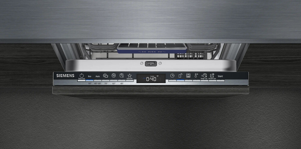 Zmywarka SIEMENS SR63EX24KE wyposażona jest w system zdalnego sterowania za pomocą aplikacji. Możesz teraz korzystać z aplikacji mobilnej Home Connect, aby połączyć się ze swoją zmywarką online oraz zdalnie wysyłać zapytania i monitorować stan swojego urządzenia. Konfiguracja zmywarki SIEMENS jest prosta, dzięki funkcji EasyStart/Program Assistant, która wybiera właściwe ustawienia dla każdego ładunku.
