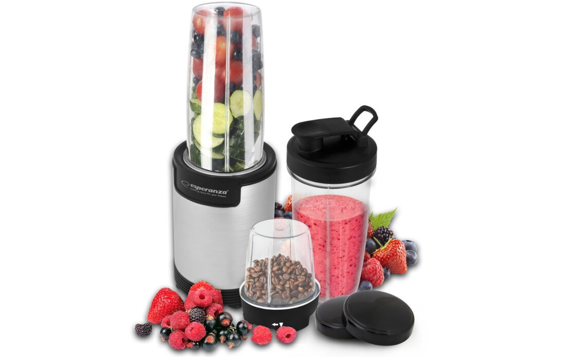 Blender kielichowy ESPERANZA Nutri Bombo EKM030, 2 noże, młynek, kubek do miksowania, 2 x wieczko, dokumentacja.