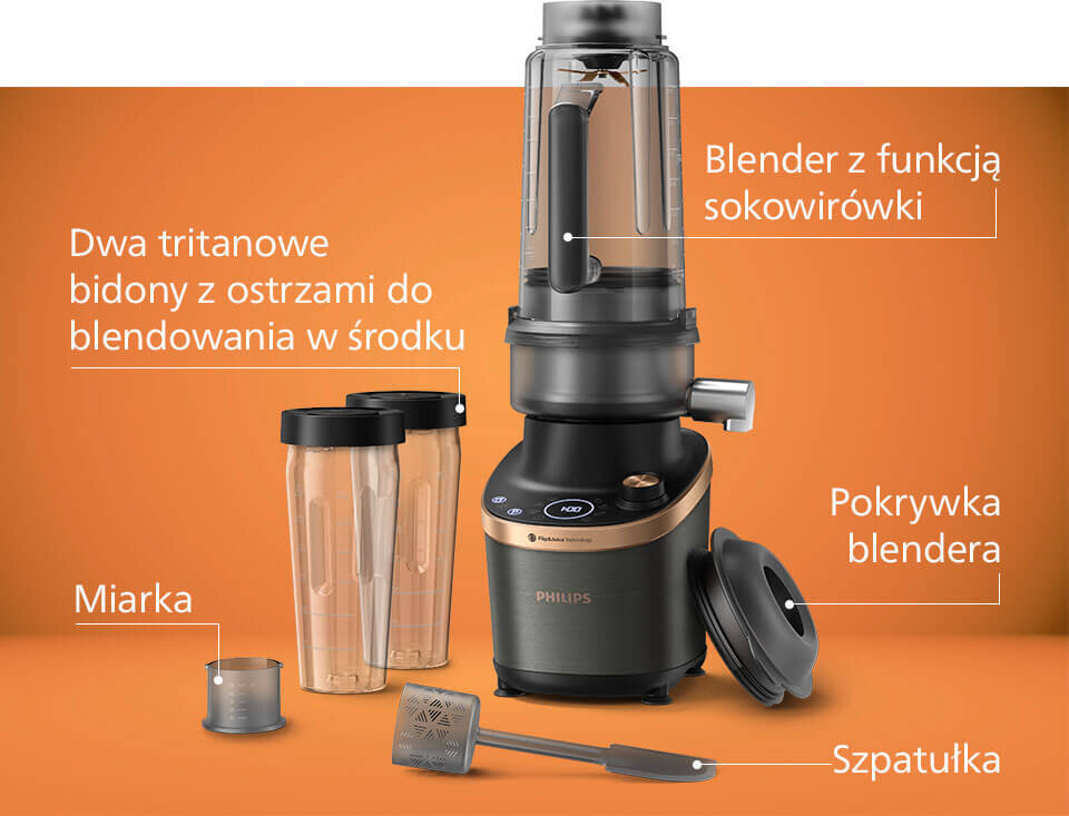 Technologia Flip&Juice™ umożliwi Ci blendowanie i wyciskanie soku, używając jednego urządzenia