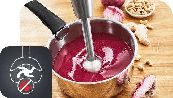 Blender ręczny Tefal Infinity force Pro posiada uchwyt z technologią płynnej zmiany prędkości. Naciskając na przycisk możesz płynnie zwiększać prędkość miksowania, odpowiednio do rodzaju składników.