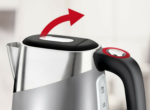 Dzięki ukrytemu w rączce przyciskowi EasyOpen nie musisz już ręcznie otwierać pokrywki czajnika.