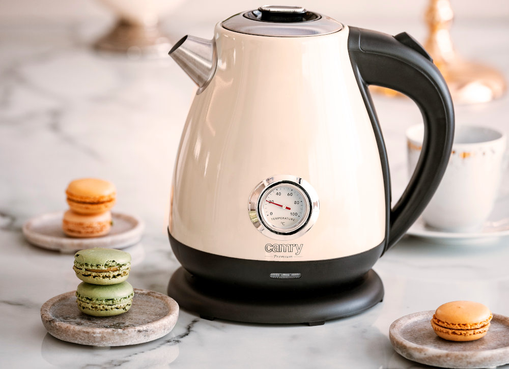 Czajnik CAMRY CR 1344C z termometrem, przydatny jest w każdej kuchni. Bezpieczeństwo zapewnia blokada uniemożliwiająca włączenie pustego czajnika oraz automatyczne wyłączenie po zagotowaniu wody. Funkcjonalność zwiększa stabilna podstawa i czytelny wskaźnik poziomu wody.