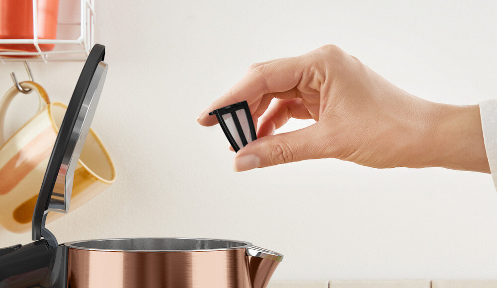 Wymienny filtr przeciw kamieniowi zapewnia czystość czajnika i wody. Dzięki niemu możesz cieszyć się doskonałym smakiem ulubionych napojów.