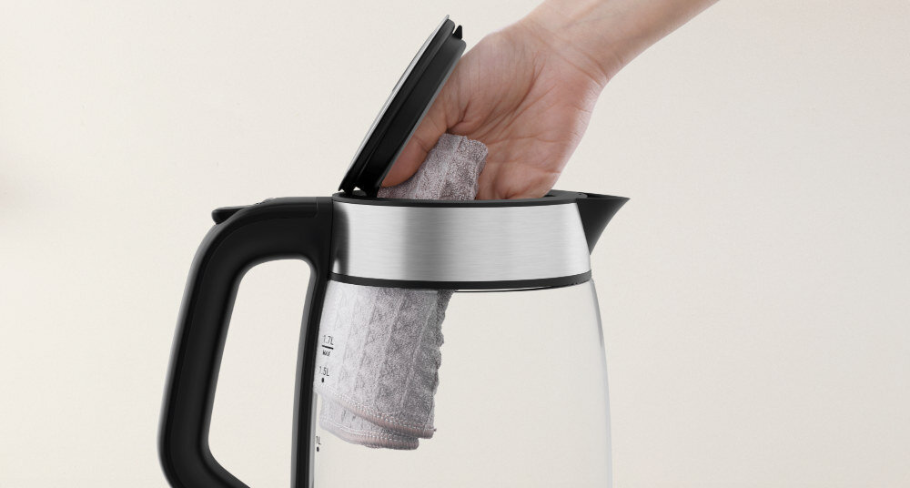 Szeroko otwierana pokrywa czajnika oraz ukryty element grzewczy to rozwiązania, które ułatwiają proces czyszczenia. Dzięki szerokiemu otwarciu pokrywy, dostęp do wnętrza jest wygodny, co umożliwia łatwe usuwanie kamienia oraz zanieczyszczeń. Ukryty element grzewczy eliminuje trudności związane z czyszczeniem osadów - nie ma bezpośredniego kontaktu z wodą.