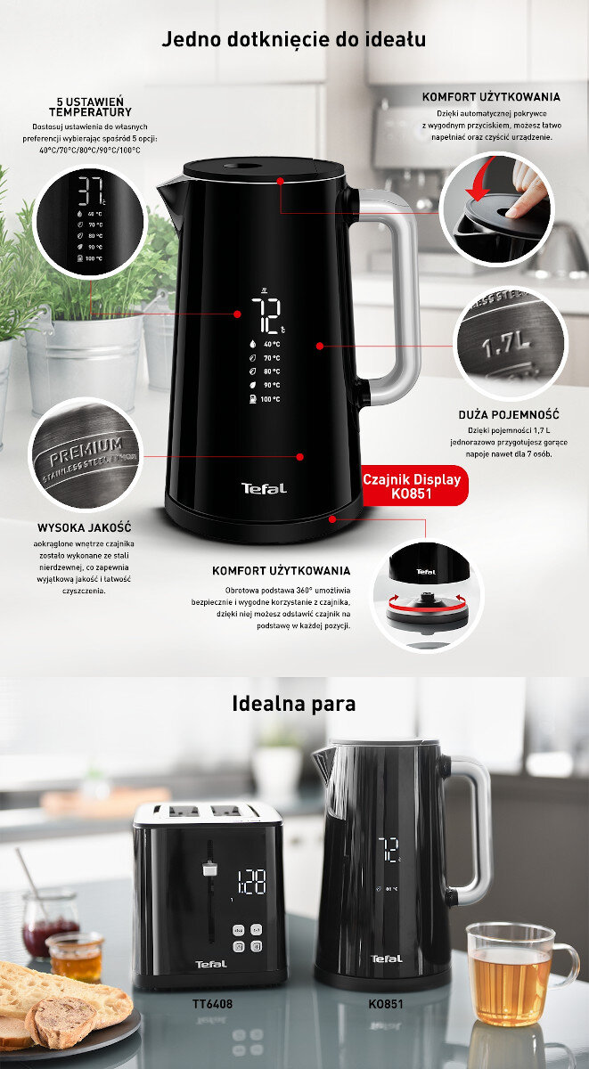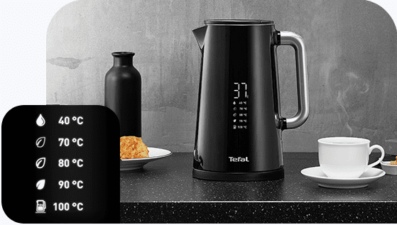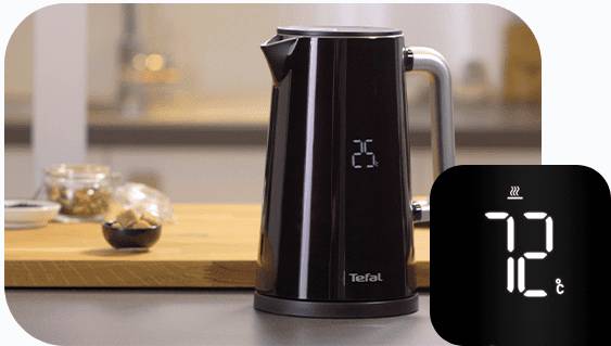 Czajnik Tefal Display wyróżnia się swoją elegancją i funkcjonalnością. Cyfrowy wyświetlacz w obudowie czajnika, pozwala odczytać realną temperaturę wody, również w trakcie gotowania.