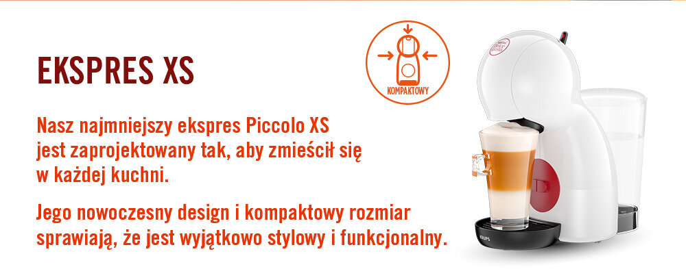 Wyjątkowo poręczny ekspres kapsułkowy NESCAFÉ® Dolce Gusto® Piccolo XS marki Krups został zaprojektowany tak, by zajmował minimalną przestrzeń. Dzięki temu to urządzenie o eleganckim wyglądzie mieści się nawet w niewielkich kuchniach. Wymiary Piccolo XS to jedynie 14 cm x 28 cm x 27 cm. Wysokociśnieniowy system (do 15 barów) pozwala na przygotowanie kawy najwyższej jakości z gęstą i aksamitną pianką. Hermetycznie zamykane kapsułki zachowują świeżość kawy, więc możesz cieszyć się bogatym aromatem za każdym razem. Wystarczy włożyć kapsułkę i przestawić dźwignię, by przygotować jeden spośród ponad 30 doskonałych napojów. Możesz wybierać spośród mocnego Ristretto, intensywnego Espresso, aromatycznego Lungo i pełnego smaku Grande, aż po pieniste Cappucciono i gładkie Latte Macchiato, a nawet gorącą czekoladę, herbatę czy zimne napoje. Szybki system nagrzewania ekspresu osiąga idealną temperaturę w ciągu około 40 sekund, więc nie musisz długo czekać, aby cieszyć się swoją ulubioną kawą. Praktyczna funkcja tryb eko automatycznie wyłącza urządzenie po 1 minucie bezczynności, dzięki czemu ekspres należy do klasy energetycznej A. Postaw na proste parzenie kawy z ekspresem kapsułkowym NESCAFÉ® Dolce Gusto® Piccolo XS.