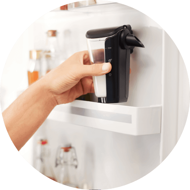 W systemie LatteGo, podczas robienia kawy, w dowolnym momencie możesz dolać więcej mleka – wystarczy uchylić pokrywkę. LatteGo możesz także wraz z mlekiem wstawić do lodówki.