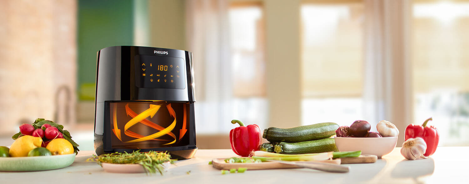 Wyjątkowa technologia Rapid Air zapewnia właściwy przepływ powietrza, a układ wnętrza urządzenia optymalnie rozprowadza ciepło, dbając o równomierne opiekanie potraw. Pyszne, chrupiące posiłki przygotujesz bez lub z niewielką ilością oleju2.