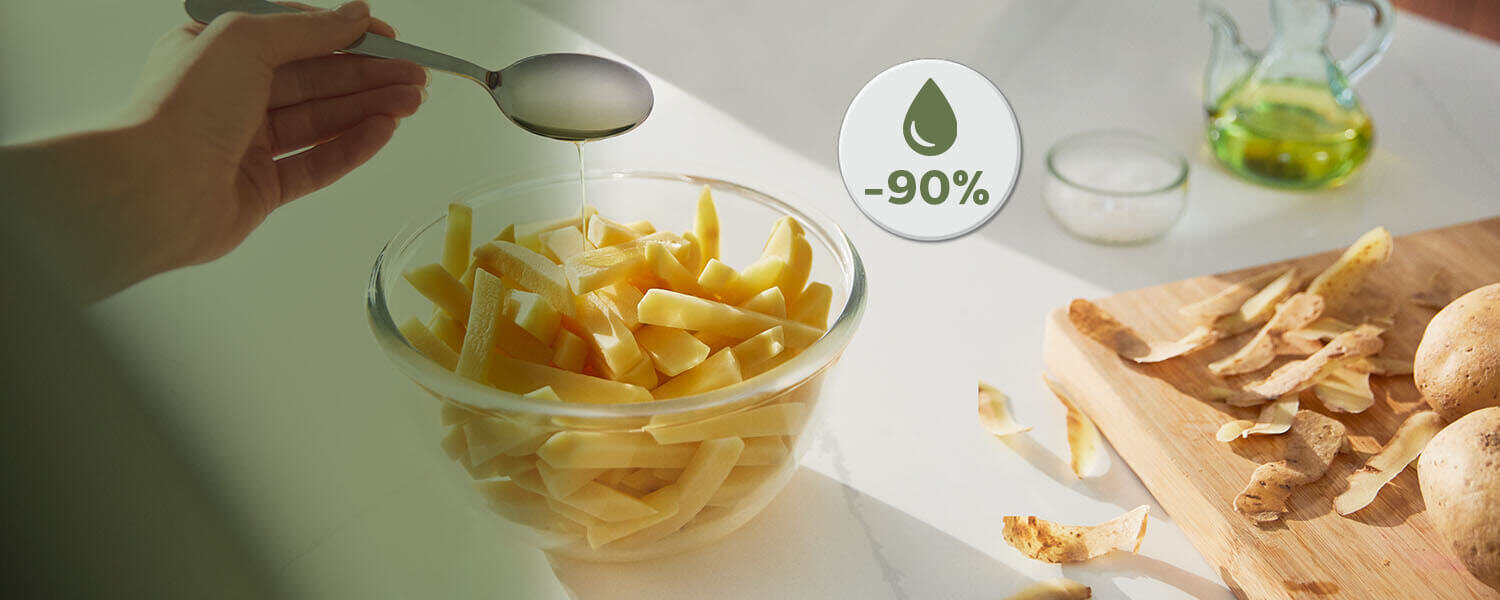 Smażenie z Ovi odbywa się przy użyciu gorącego powietrza i jedynie minimalnej ilości oleju. Przygotowane w nim dania mają więc nawet do 90% mniej tłuszczu1.