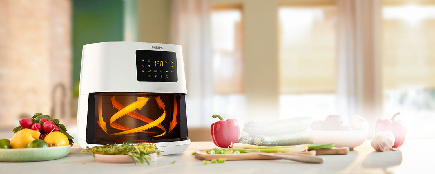 Wyjątkowa technologia Rapid Air zapewnia przepływ powietrza, a budowa urządzenia umożliwia optymalne rozprowadzanie ciepła i równomierne opiekanie potraw. Pyszne, chrupiące posiłki przygotujesz bez lub z małą ilością oleju2.