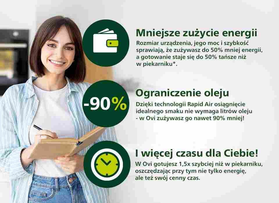 Rozmiar urządzenia, jego moc i szybkość sprawiają, że zużywasz do 50% mniej energii, gotowanie staje się do 50% tańsze niż w piekarniku*.